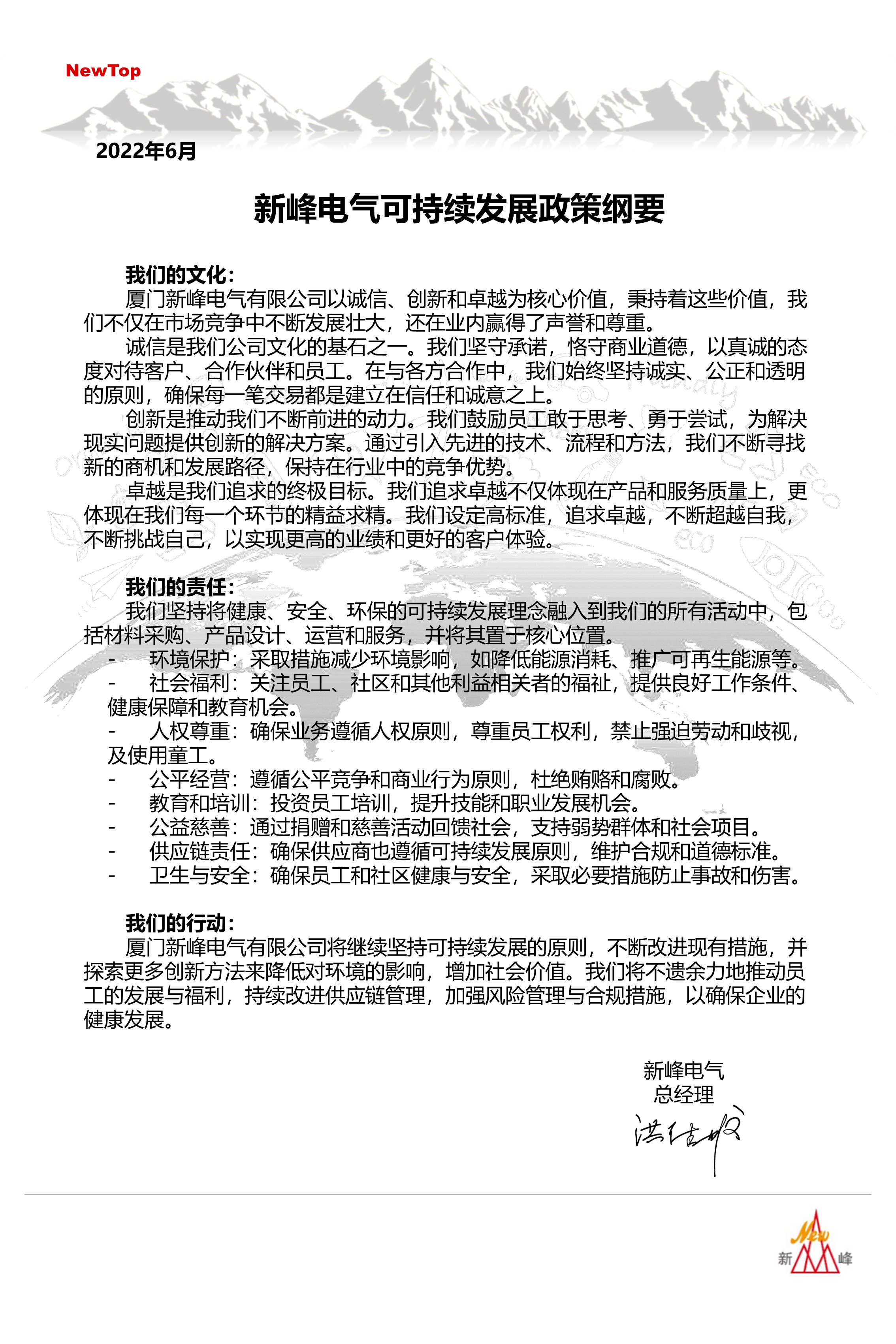 新峰電氣可持續(xù)發(fā)展政策綱要